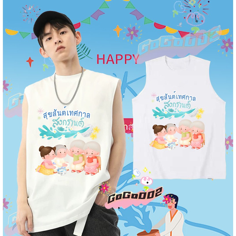พร้อมส่ง ใหม่ เทศกาลสงกรานต์ เสื้อกั๊กแขนกุด 2568 Songkran Festival เสื้อกั๊ก ดำ / ขาว เย็นสบาย ผ้าฝ้าย แขนสั้น คอกลม พิมพ์ลายเทศกาล คุณภาพสูง ขนาด#052 ราคา 139 บาท