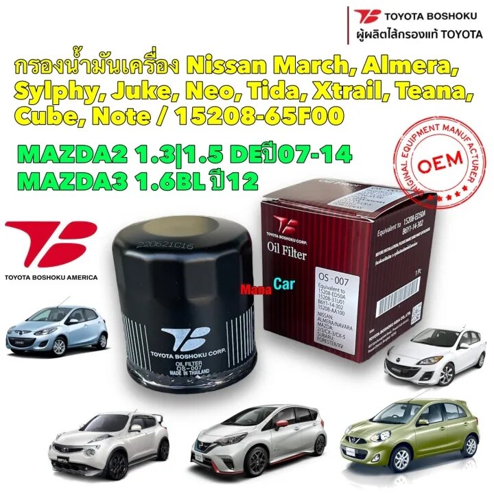 กรองน้ำมันเครื่อง Nissan March, Almera, Sylphy, Juke, Neo, Tida, Xtrail, Teana, Cube, Note / Toyota Boshoku OS-007 ราคา 95 บาท