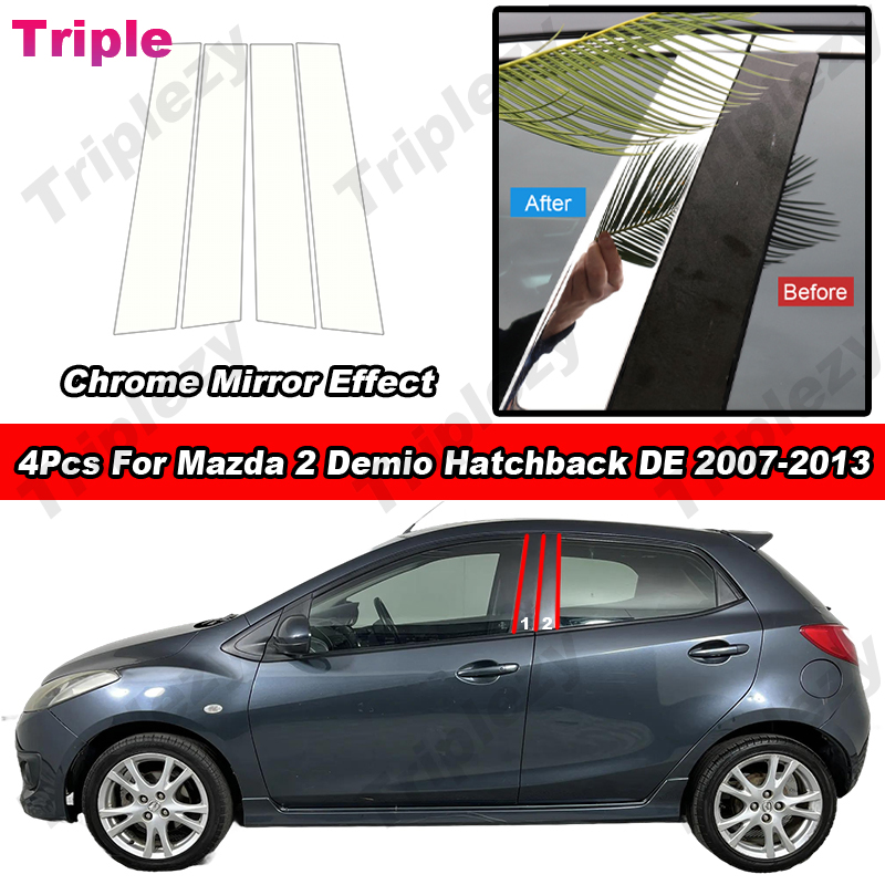 4Pcs Glossy Chrome PC Material Mirror Effect Car Door Window Center Column B C Pillar Post Decoration Decals Cover Trim Sticker Styling For Mazda 2 Demio Hatchback DE 2007-2013