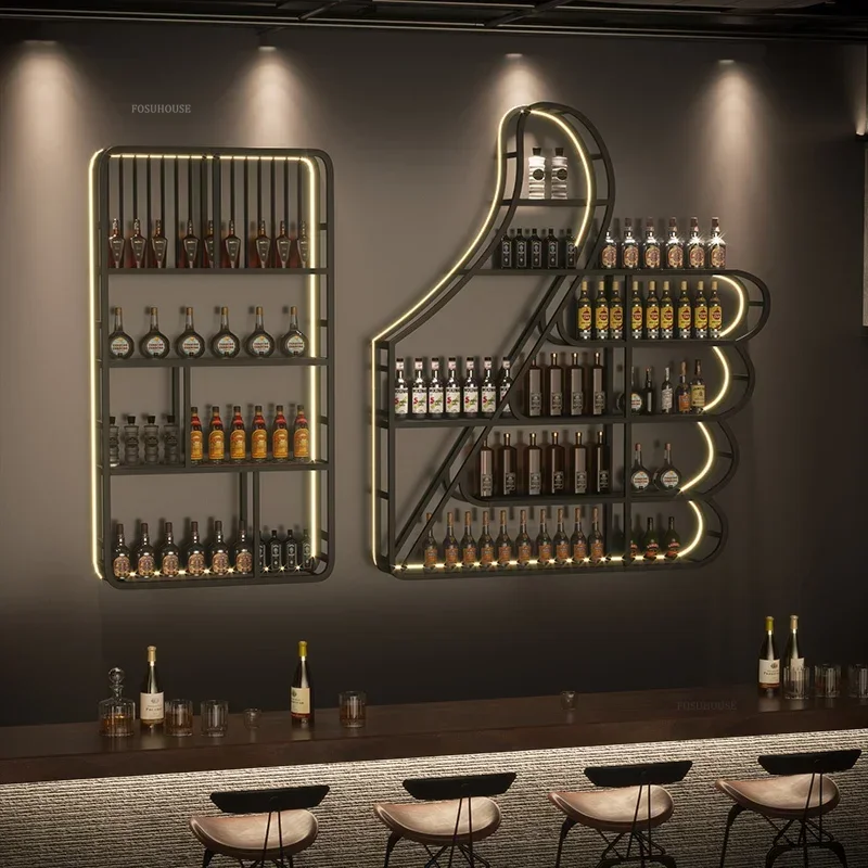 ✿AGAIN❀ Nordic Style Iron Bar Cabinets Wall Mounted Display Wine Rack Hotel Restaurant Shelf Creative Luminous Wine Rack Bar Furniture