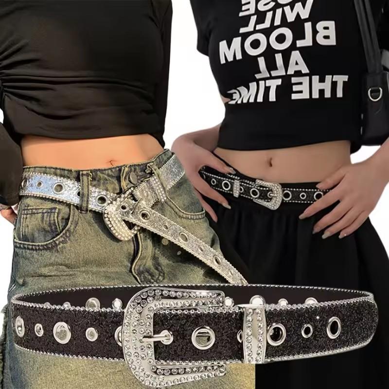 สายเข็มขัดสไตล์พังค์ Y2K ประดับด้วยเพชร - สายเข็มขัดหนัง PU ที่ฝังเพชร
