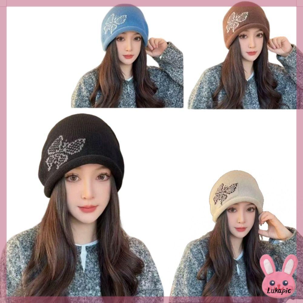 LUKAPIC ลายผีเสื้อ หมวกไหมพรมถัก หนาขึ้น ป้องกันลม หมวกบีนนี่แบบมีเชือกผูก แบบสบายๆ รักษาความอบอุ่น หมวกป้องกันหู ผู้หญิง