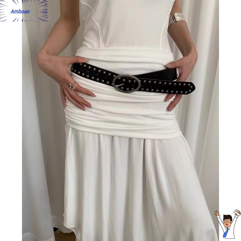 AMBOAE หัวเข็มขัดอัลลอยด์ เข็มขัดหมุดโบฮีเมียน ปรับได้ปรับได้ หนังพียู เดรสสายรัดเอวตกแต่ง เรโทร สายรัดเอวผอม สำหรับผู้หญิง