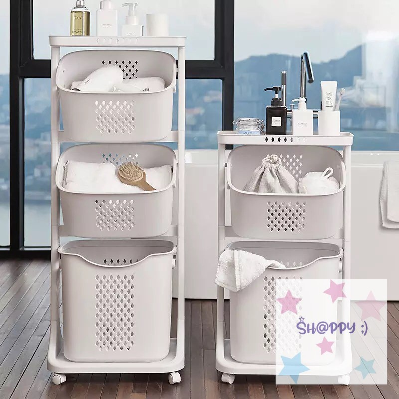 ชั้นตะกร้า 3 ชั้น ชั้นวางของสไตล์ญี่ปุ่น ตะกร้าผ้า ตระกร้าใส่ของ มีล้อ ขนาดใหญ่จุของได้เยอะ พาพกง่าย สินค้ามาใหม่! S.Happy