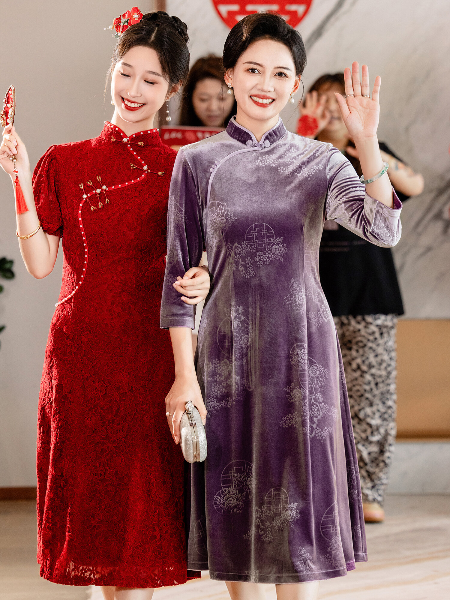 ชุดกี่เพ้าไหมสีม่วง ชุดเจ้าสาว ชุดกี่เพ้าผู้หญิงวัยกลางคน ชุดราตรี ทรงเข้ารูป เดรสยาวปานกลาง สไตล์หรูหรา แขน 7 ฟุต
