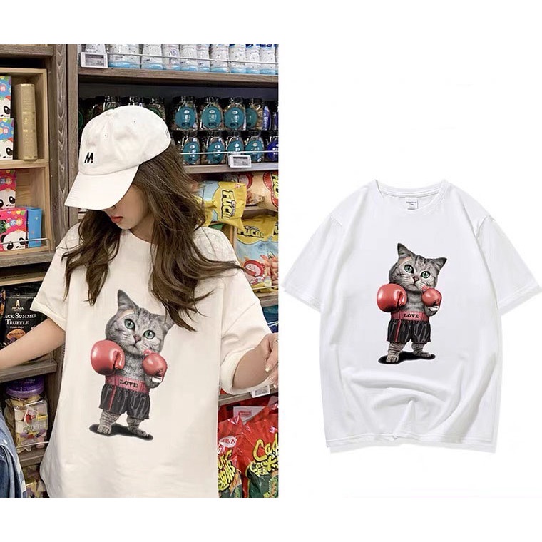 -FF.fashion-เสื้อยืด คอกลม แขนสั้น ผ้านิ่ม พิมพ์ลายแมวนักมวย น่ารักๆ สไตล์เกาหลี #9636
