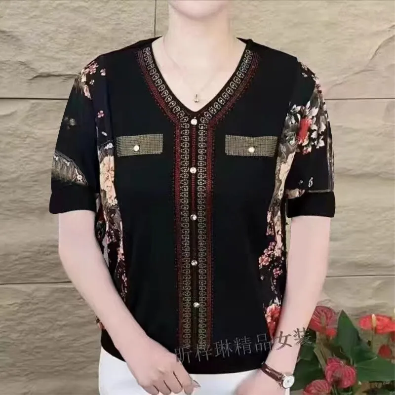 2025 New High-end V-neck Hot Diamond Cover Belly Slim Middle-aged Mother Dress Printed Tops Stylish T-shirt Female