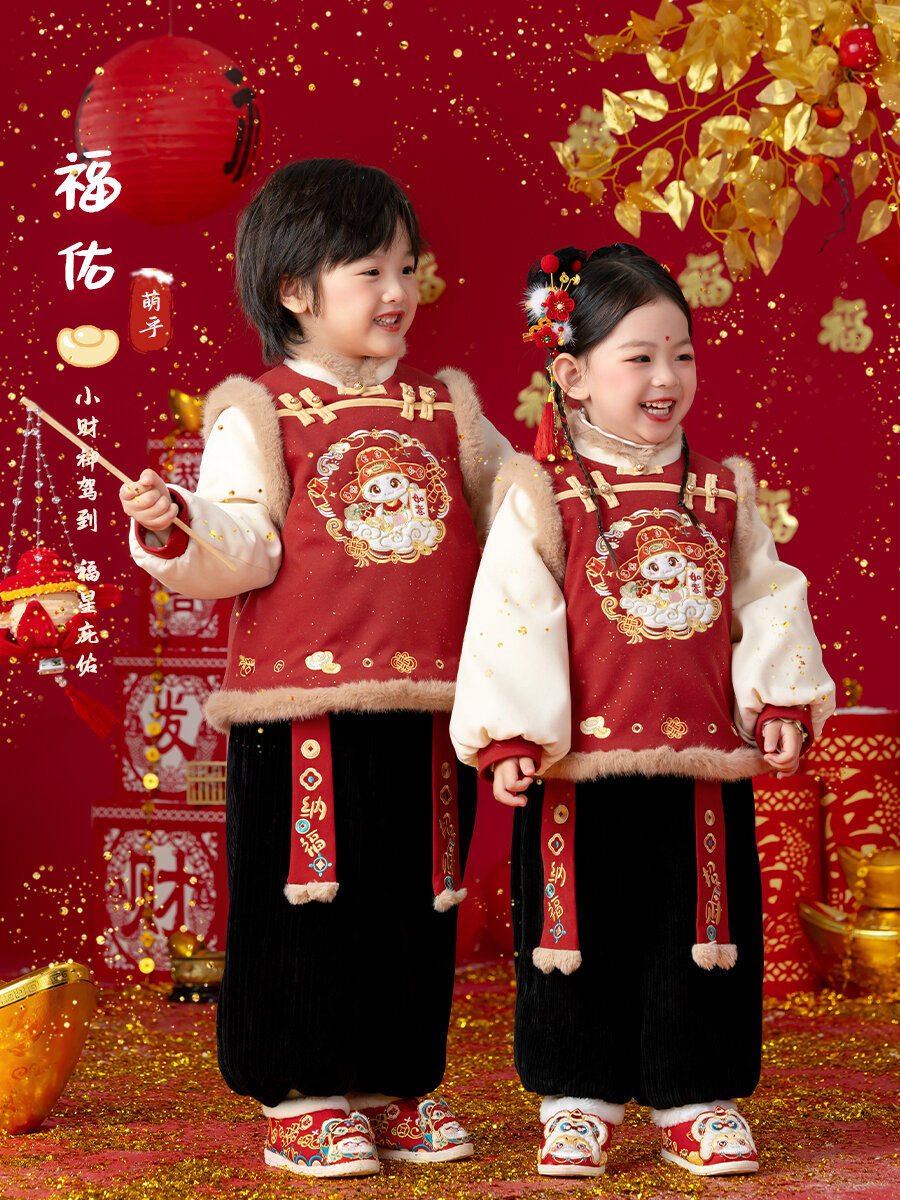 ชุดกี่เพ้าฤดูใบไม้ร่วง/ฤดูหนาวสำหรับเด็กชายและเด็กหญิง ชุดกี่เพ้าสีแดง ชุดลำลอง ชุดฮันฟู่ เสื้อแจ็คเก็ตและกางเกง ชุดเด็ก เสื้อผ้าเด็ก ชุดฮันฟู่